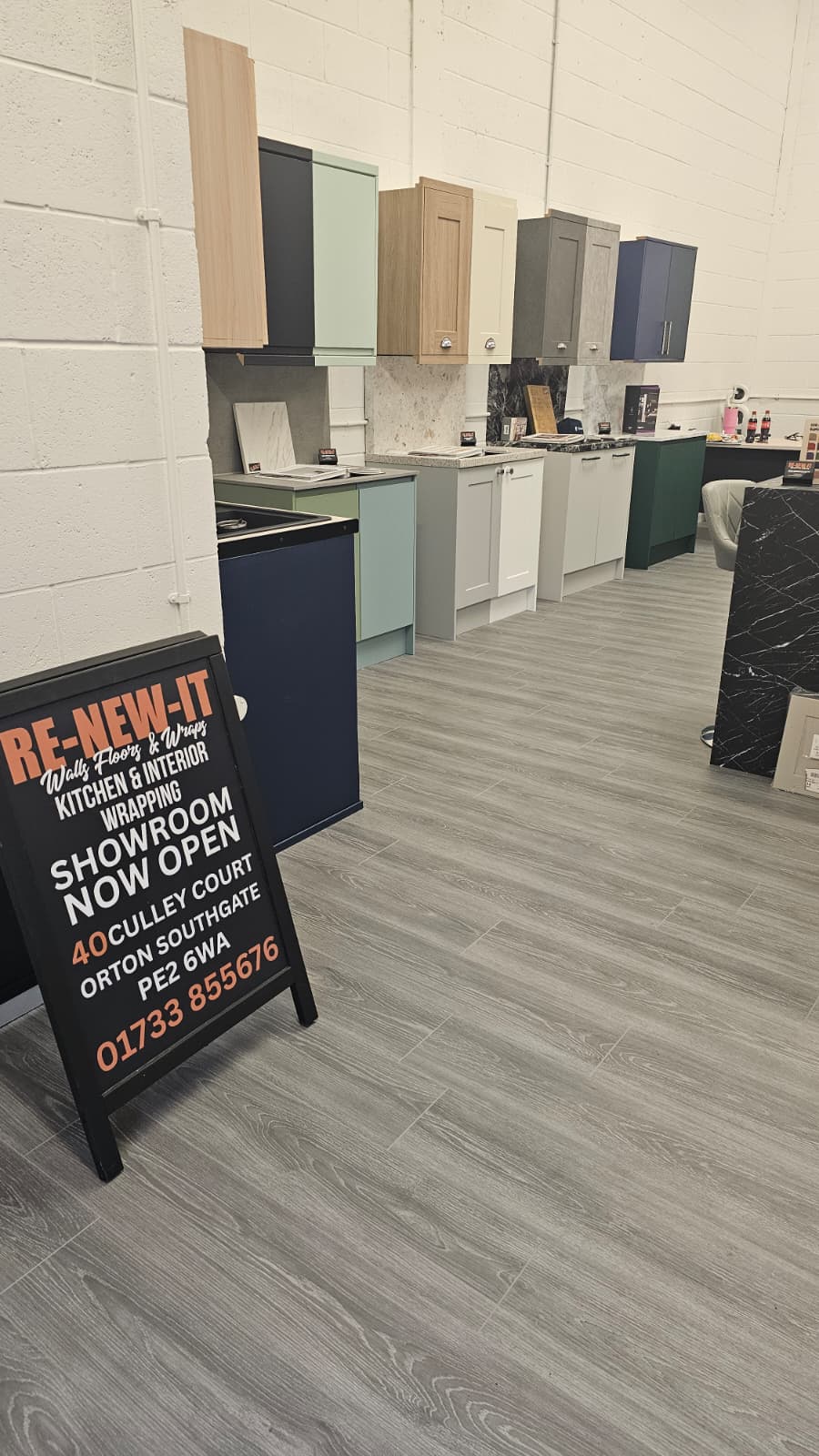 Step into the Re-New-It Showroom – Peterborough’s home of stylish kitchen transformations. Explore our stunning range of kitchen wraps in person, get inspired by real-life examples, and speak directly with our expert team to bring your dream makeover to life.